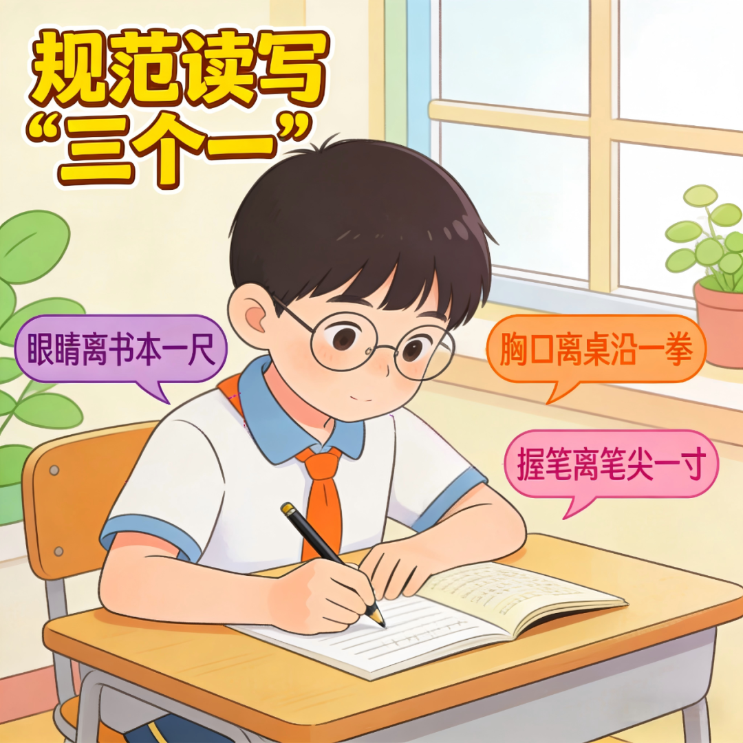 规范读写习惯:注意“三个一”:眼睛离书本一尺(约33厘米),胸口离桌沿一拳,手指离笔尖一寸(约3厘米)。