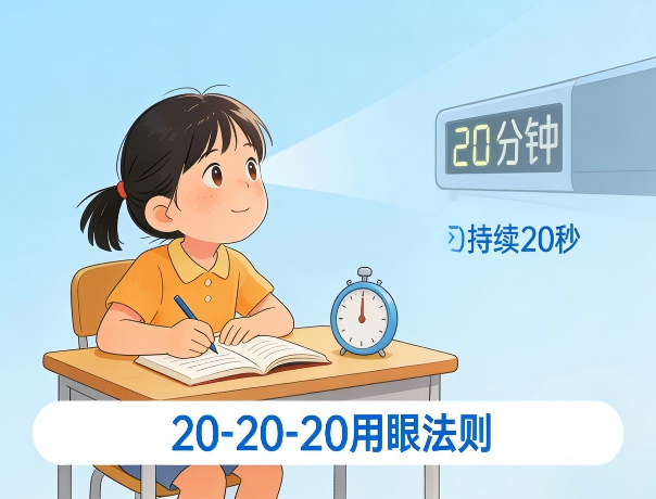 严控电子设备:近视防控的护眼黄金法则:每近距离用眼20分钟,向20英尺(约6米)外远眺至少20秒,利用远眺放松眼睛,预防近视,减轻视疲劳。